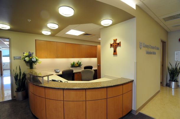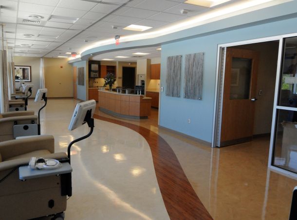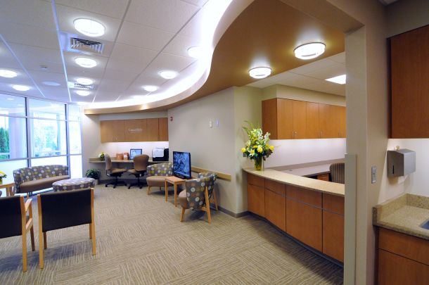 This 12,500 SF two-story addition connects to the Main Hospital building at both the ground level and first floor. The Cancer Center houses Radiation and Medical Oncology services featuring two LINAC vaults. Radiation Oncology (9,000 SF) is located on the ground floor and includes a separate building entrance and consists of an outpatient reception area, exam rooms, community conference rooms and physician offices. An existing 500 SF area was renovated to accommodate radiology administrative offices. Medical Oncology (3,000 SF), located on the first floor, consists of reception space, exam rooms, infusion cubicles with a nurse station, physician offices and ancillary support space.