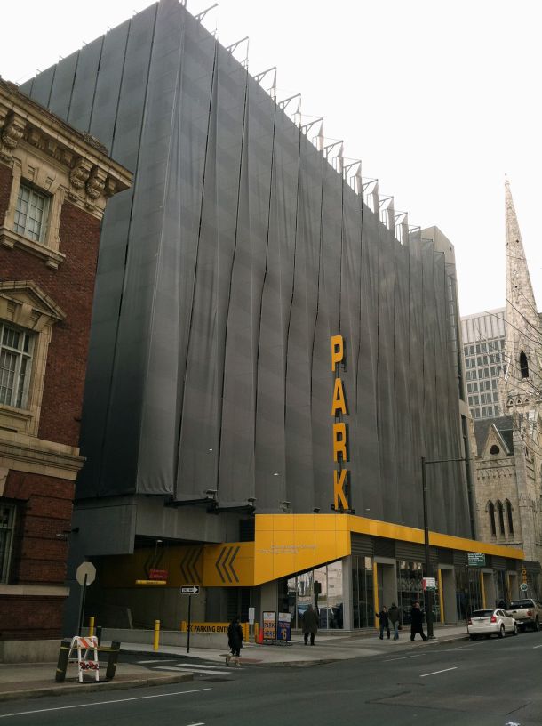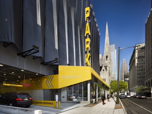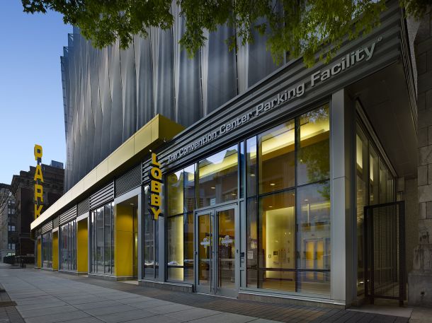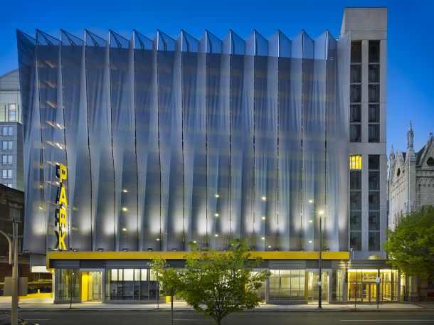 TN Ward constructed this 10-level precast concrete parking garage on Arch Street in Philadelphia with 540 parking space capacity including 16,000 SF of ground floor retail space. The functional design is comprised of double threaded helix with jump ramps at turning bays based on the length of the site and the height of the garage. Glass-backed elevators provide passive security for parking patrons. The building façade is clad in tensioned, perforated fabric mesh panels. This 205,000 SF facility also features a 3,500 SF green roof atop a canopy extending along Arch Street.